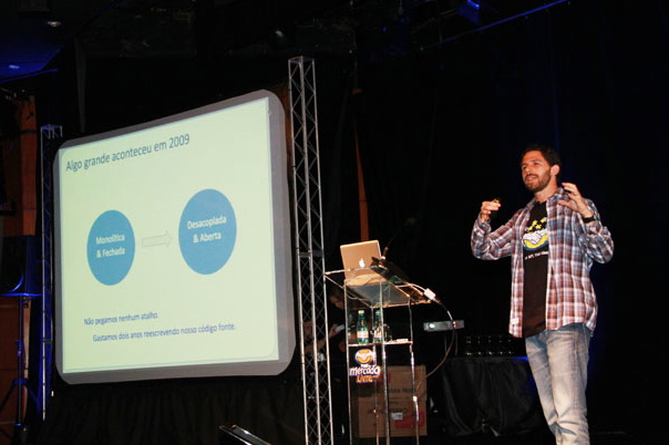 Yo aburrí un poco a la audiencia explicando cómo pasamos de una plataforma monolítica y cerrada a una desacoplada y abierta.