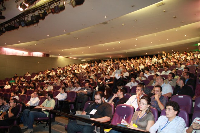 Ayer se marcó un hito importantísimo para MercadoLibre, y quizás también para el e-commerce latinoamericano. Después de años de trabajo anunciamos la apertura de nuestra plataforma, en el contexto de la primera Conferencia para Desarrolladores de MercadoLibre. La cita fue en San Pablo, en el espectacular Hotel Renaissance. La convocatoria superó nuestras expectativas: sala llena de «geeks»!